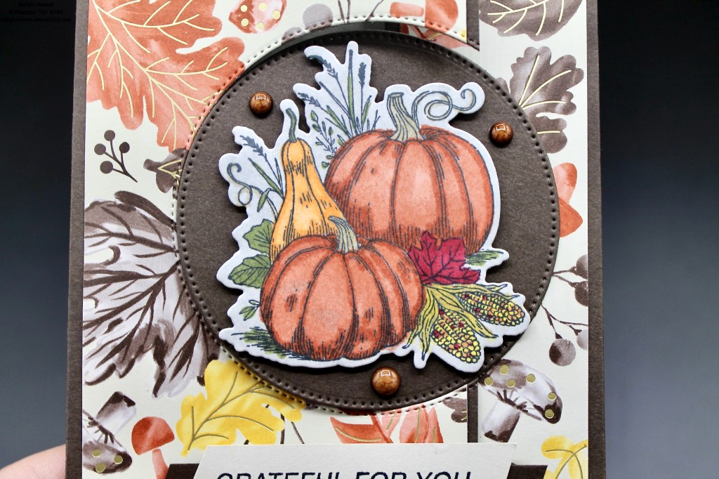 This beautiful card was inspired by a swap card that I received from Amy Rich, which I post a couple of weeks ago on my swap card Friday post. Her card featured the cute Squirrel, but I’ve picked some pretty pumpkins from the Amber Autumn stamp set.