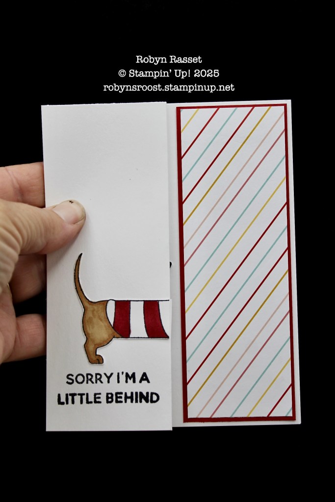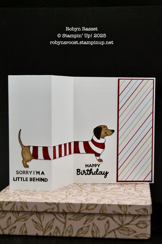 The card base is 8 1/2″ x 5 1/2″ scored at 2 1/8″ and 4 1/4″. To get some tips on coloring and assembling the dog watch my Humorous Belated Birthday Video.