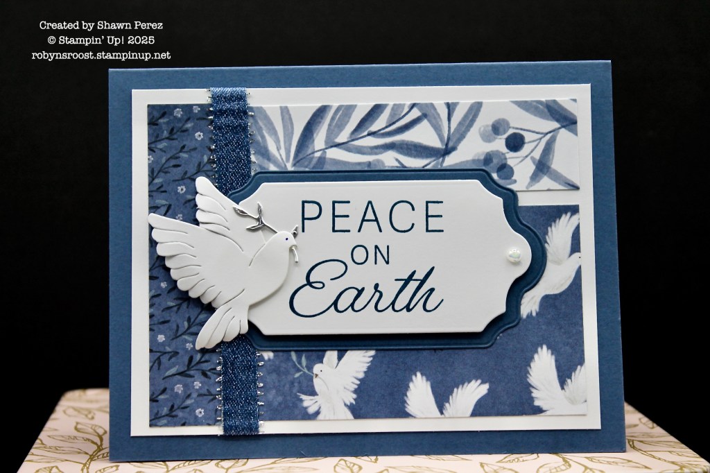 I absolutely love the details that Shawn has added to this die cut dove. By curving the feathers, adding a dot for the eye, and a small silver sprig it really steps up this card. The Misty Moonlight and Silver Ribbon adds some additional shine. Three different patterns of the designer paper were used for the background.