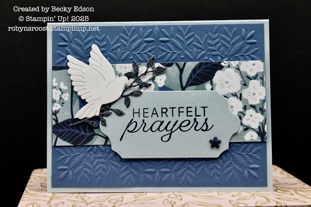 Becky has used the Peace On Earth Dies for this large dove, label and leaf sprig. The leaf sprig is also made using the Glimmer Paper. The Hues of Blue Flower Embellishments are also part of this Suite, as is the Peaceful Greenery Embossing Folder that Becky has used.