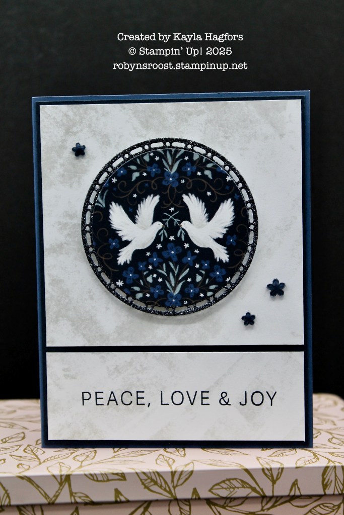 This beautiful card by Kayla uses the sparkly Peaceful Garden Glimmer Paper on a circle cut with the Spotlight on Nature Dies. Topping it off is a piece of the pretty pattern of the Peaceful Garden Designer Paper, which is just stunning with the dark blue background and white doves. I love these doves!