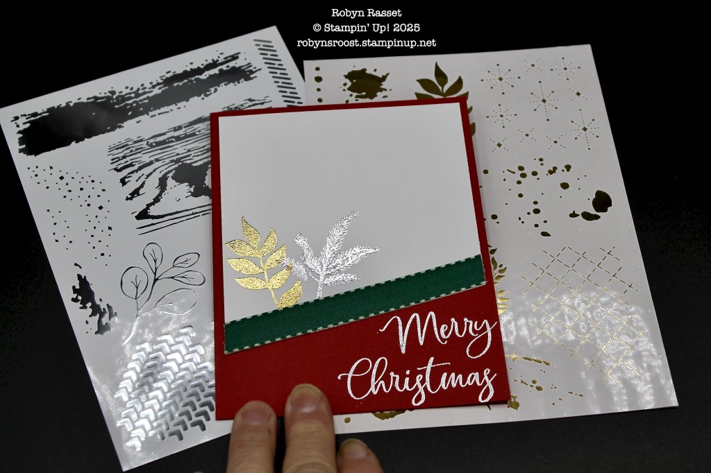 I’ve used the greeting from the stamp set and heat embossed it with Silver Embossing Powder.