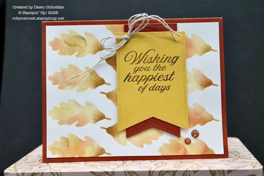 The first card is done by my friend Dawn Olchefske and is so Dawn! She always comes up with really easy to recreate simply beautiful cards. This card uses the September Paper Pumpkin kit, Fall for Toile.