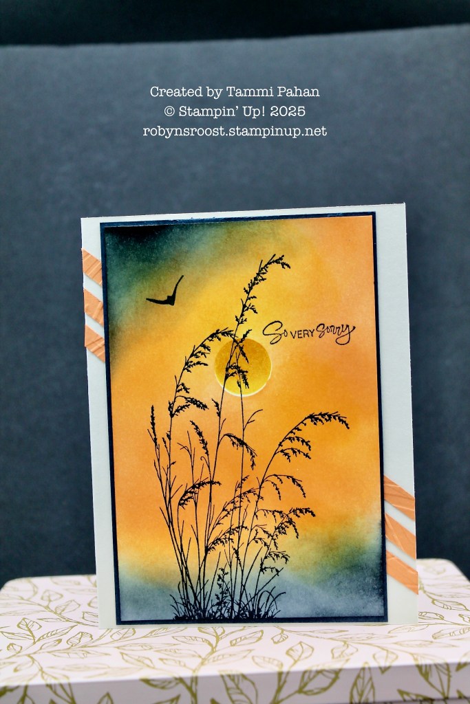 Tammi has done some beautiful sponging on this background and added some Wink of Stella for a little sparkle on the sun. The Prairie Grass stamp set is so simple yet so stunning. I love what she has done with the ribbon on the background for a very unique look.