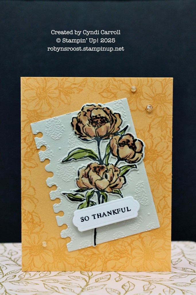 Cyndi has done some tone on tone stamping on the card base to create a subtle background. The torn note book page is die cut with the Just A Note dies and embossed with the Damask Designs Embossing Folder. The Coloring on these beautiful flowers from the Gallery Blooms stamp set is gorgeous.