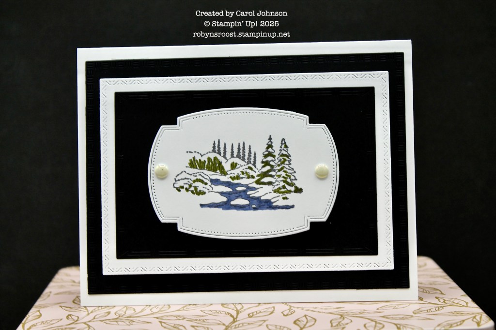 Next is a card by Carol Johnson using the Winter Scenes stamp set with layers created with the Textured Notes Dies. The image is stamped on a label created with the Traditional Label Dies.
