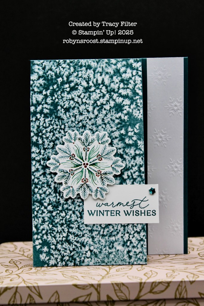 The first is a cool fun fold by Tracy Filter using the Delicate Pines Bundle and the Elegant Pine Snowflake Designer Paper.