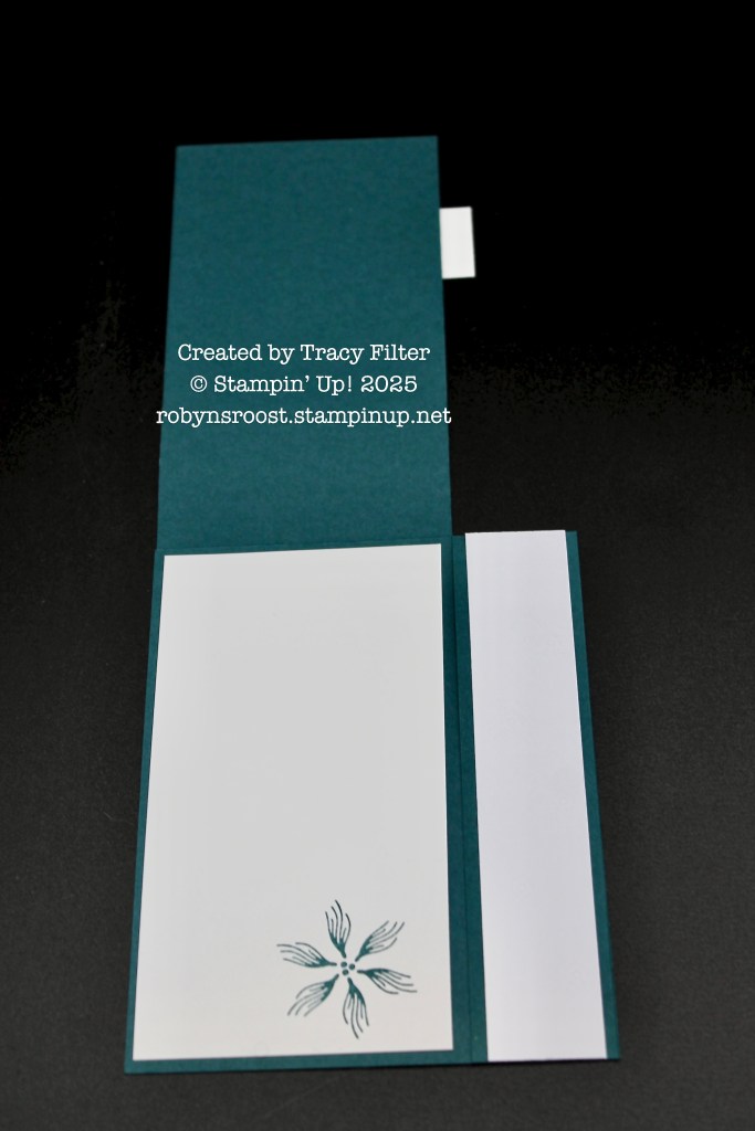 Tracy has created a unique fun fold by slicing a 1 1/4″ strip on the card front. The strip goes from the fold to the bottom and is then adhered to the inside of the card. I like the way the greeting hangs over the edge and the pretty snowflake embellishments adds some sparkle.
