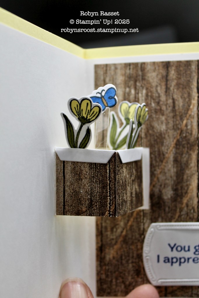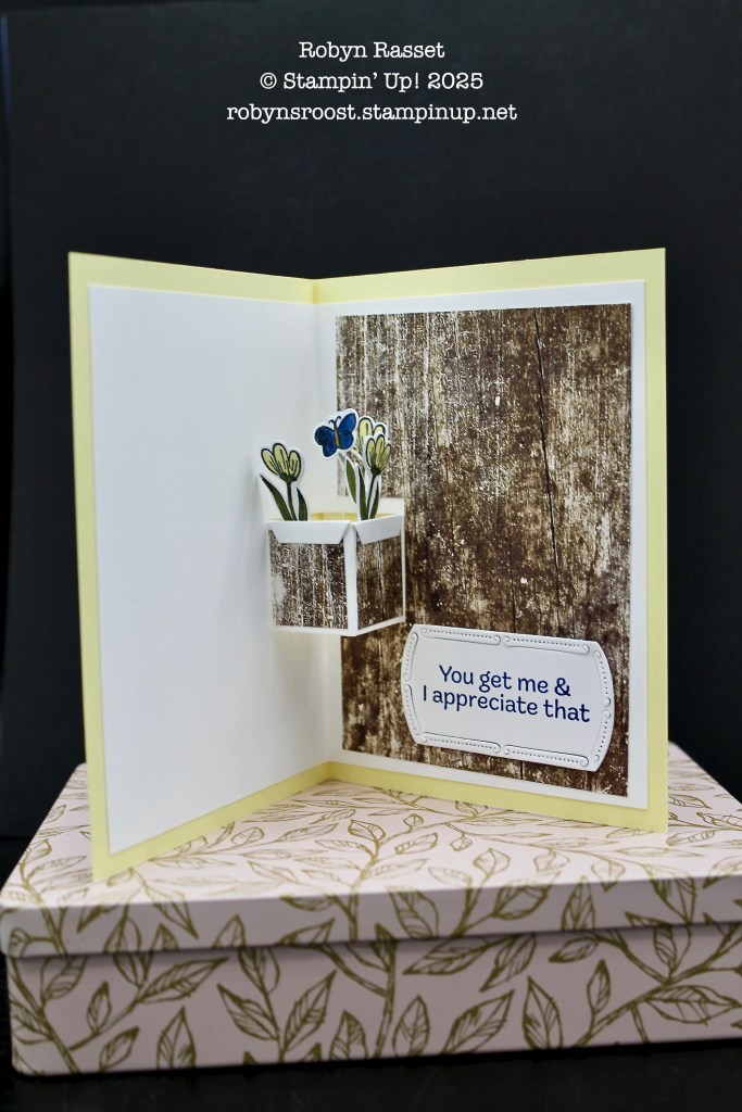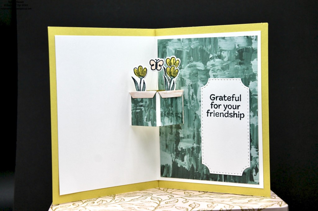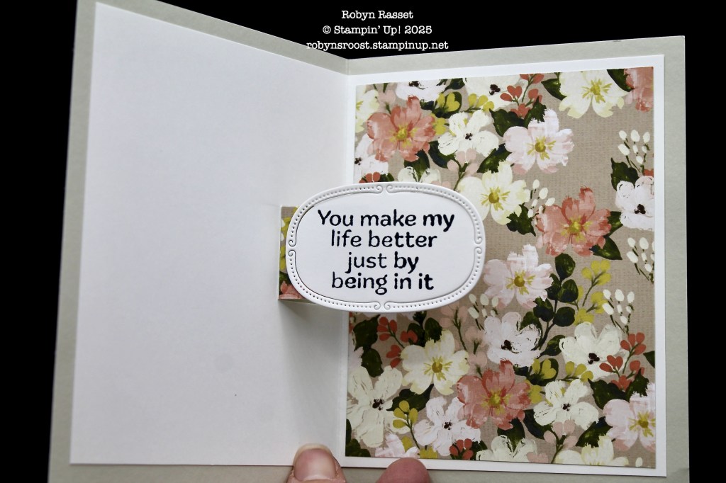 Here’s the inside of the card that I created during my Pop-Up Petals Video Tutorial. This card uses some different patterns of the Brushed with Beauty Designer Series Paper. The greeting label is from the Branching Out Die set.