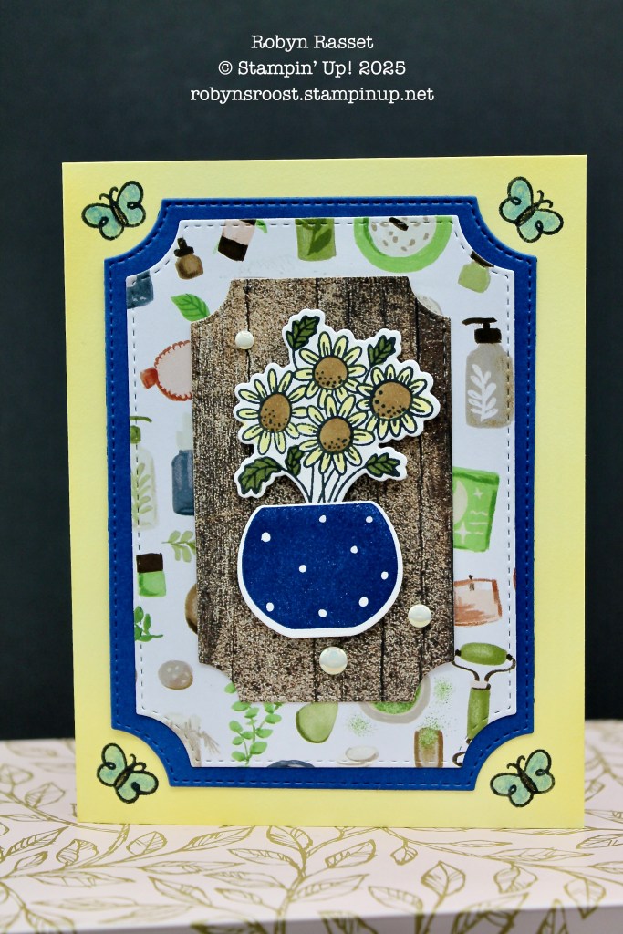 I was much happier with this version. The colors on this card are Lost Lagoon and Darling Duckling with the rose leaves done in Shy Shamrock. The layers are all cut with the Branching Out Dies. There is a small flower in the Pop-Up Petals set that would look really cute on the center of the flower pot, maybe on the next card.