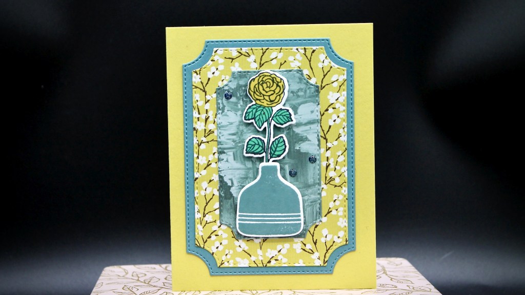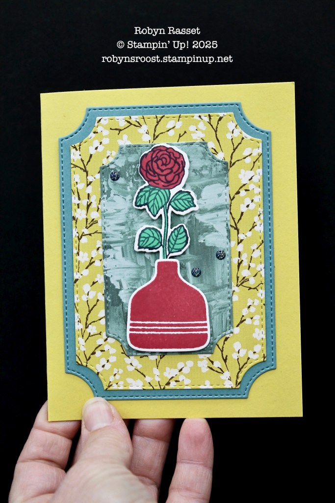 This is the way that I created the card on the video. I thought that I would really like the pop of Strawberry Slush color on the vase and rose but after studying it, decided that I didn’t really like the color combo. So I stamped another set and glued them over the top of it.