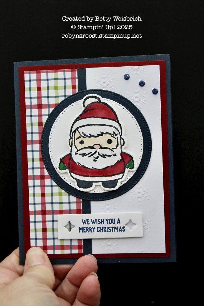 Love to color? Betty’s card features Santa from the Festive Friends stamp set. He’s been colored with Stampin’ Blend Markers (which are going to be ON SALE during the BLACK FRIDAY SALE starting Nov 25!!!). I love the background layout that she has used. Here are the dimensions if you want to CASE them: