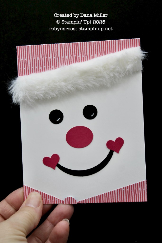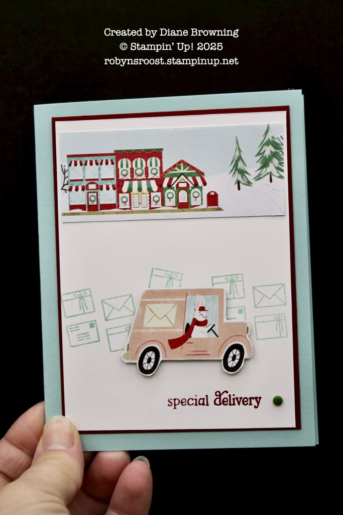 Diane has used one of my favorites, the North Pole Delivery Designer Series Paper. Stamp a few envelopes and the greeting and adhere pieces cut from from the designer paper for a quick and cute card.