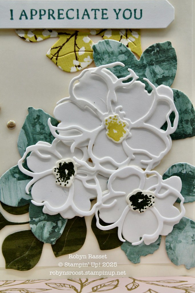 For the final card we die cut leaves from a white panel and then reinserted them with the inside parts removed. I’d like to try this technique again but maybe color the leaf cut outs before inserting them. The colored leaves are die cut from vellum and colored with Stampin’ Blend Markers.