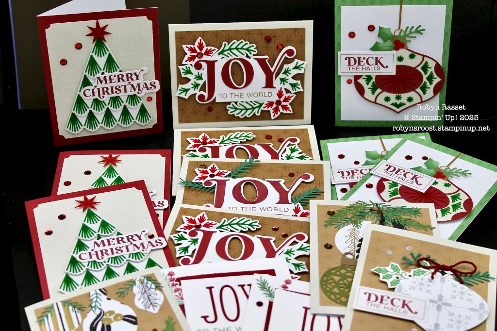 Here are the cards that I created with the November Cozy Christmas kit. The three cards in the back were made exactly to the directions in the kit. The kit made nine cards. Then I created five more cards using the stamp set, left over pieces and supplies from my stash. I use empty Paper Pumpkin boxes to store the left over bits from the kits and then pull them out when needed.