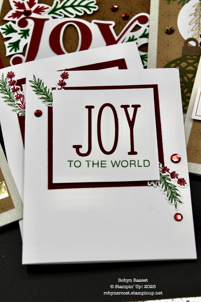 The large letters on the JOY on this card were created with the Alphabet Ala Mode Die set, while the sprigs come from the Cheers & Sips Bundle.