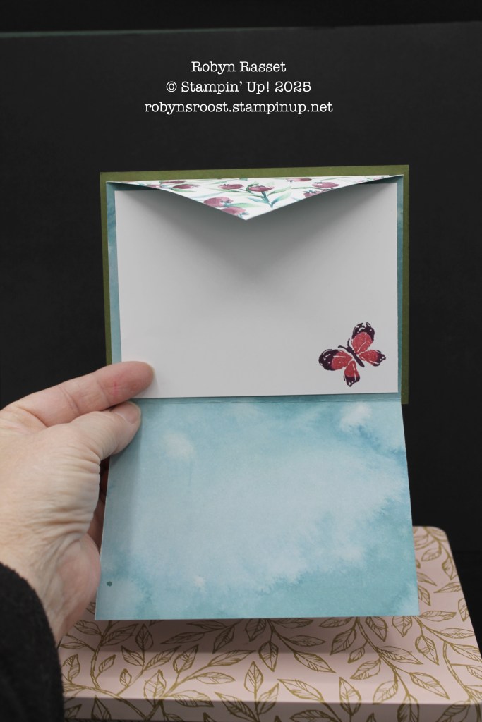 The inside uses a 3 3/4″ x 5″ piece of Basic White. The little butterfly was done using one of the first stamping techniques that I learned from Dawn Olchefske! It’s called the Rock and Roll Technique.