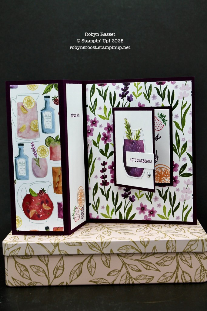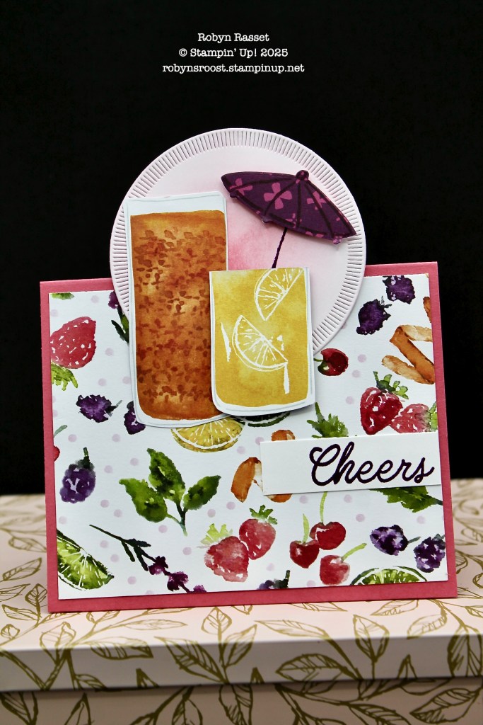 This card has a fun beachy feeling with the drink umbrella. The base is 4 1/4″ x 7″ and is scored at 3 1/2″. The die cut circle is created with the Spotlight on Nature Dies. It’s been colored with ink and a blending brush. The drinks were die cut from the Celebratory Sips Designer Paper with the Cheers & Sips Dies.