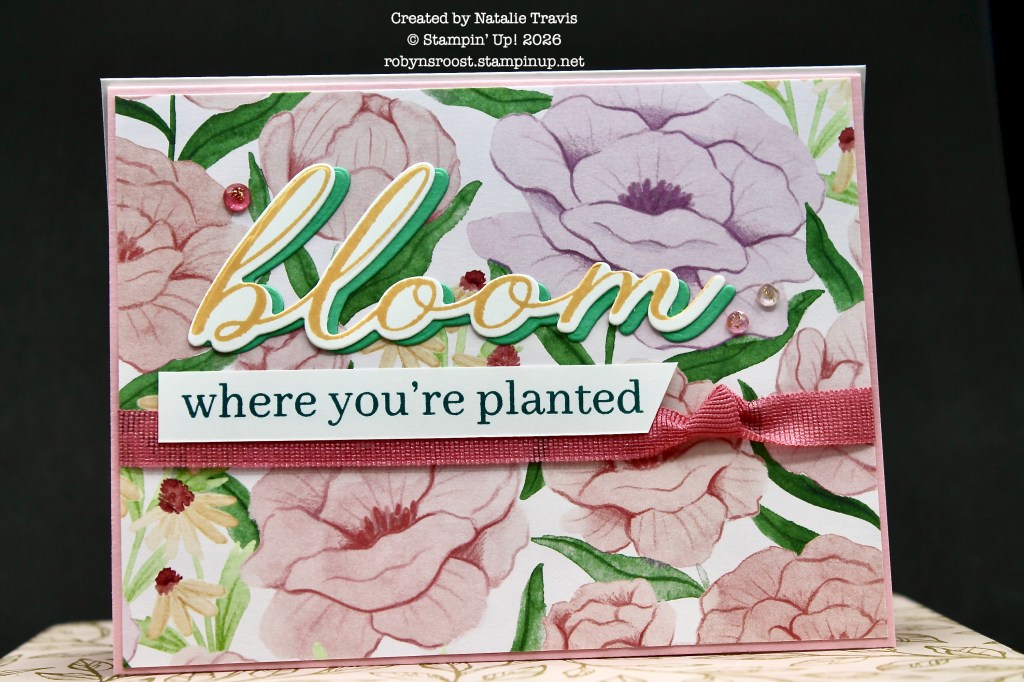 Natalie’s card really showcases the way that the stamps and dies work together with the Sweet Blooms Bundle. The stamped word is die cut then a darker paper is die cut to shadow the word. I like how the angle cut on the right side of the smaller greeting creates movement.