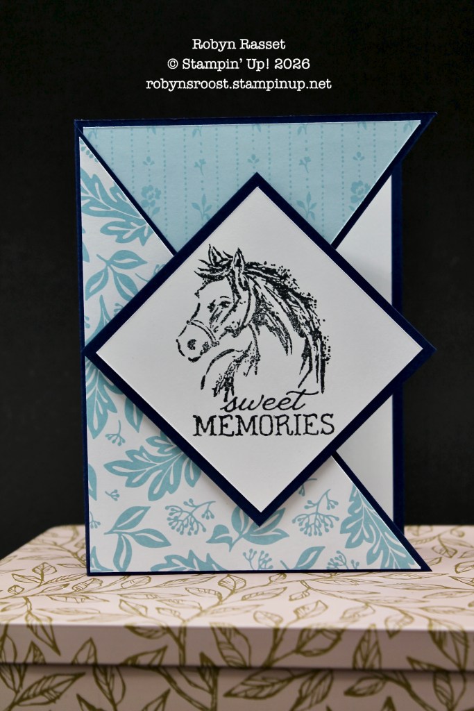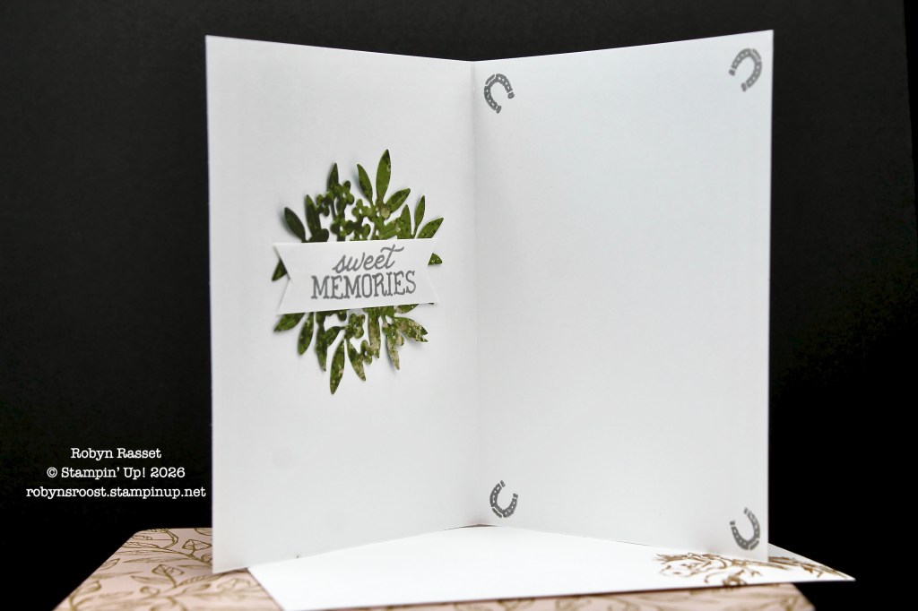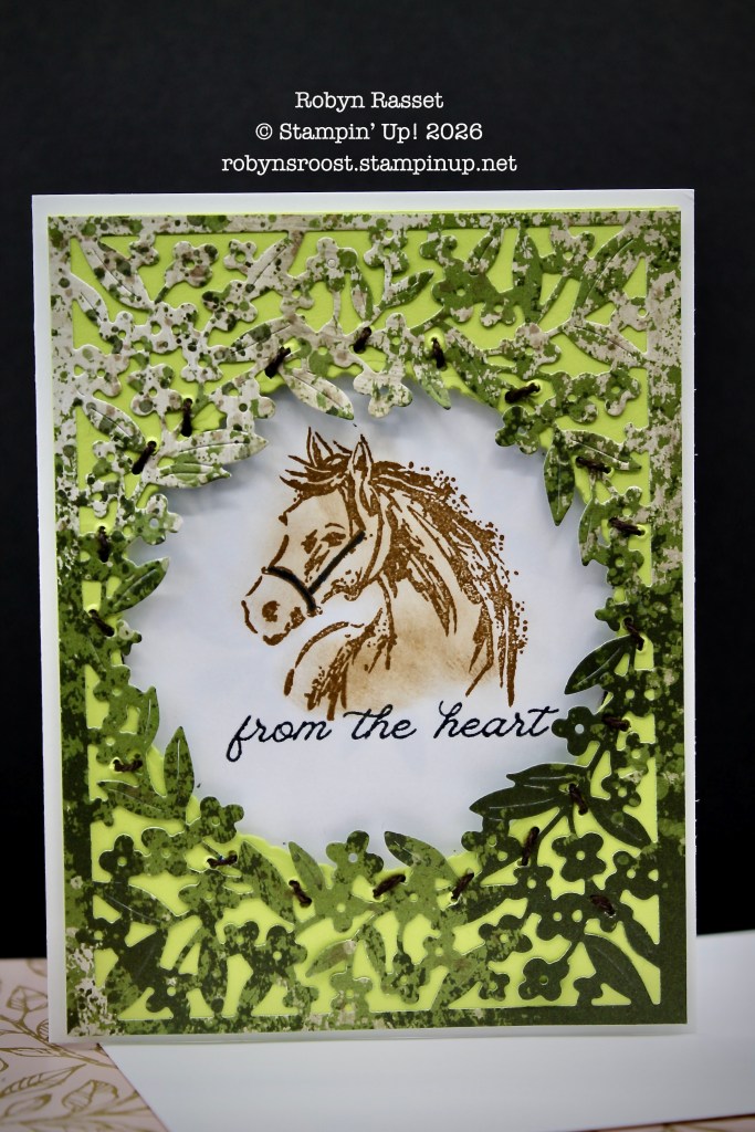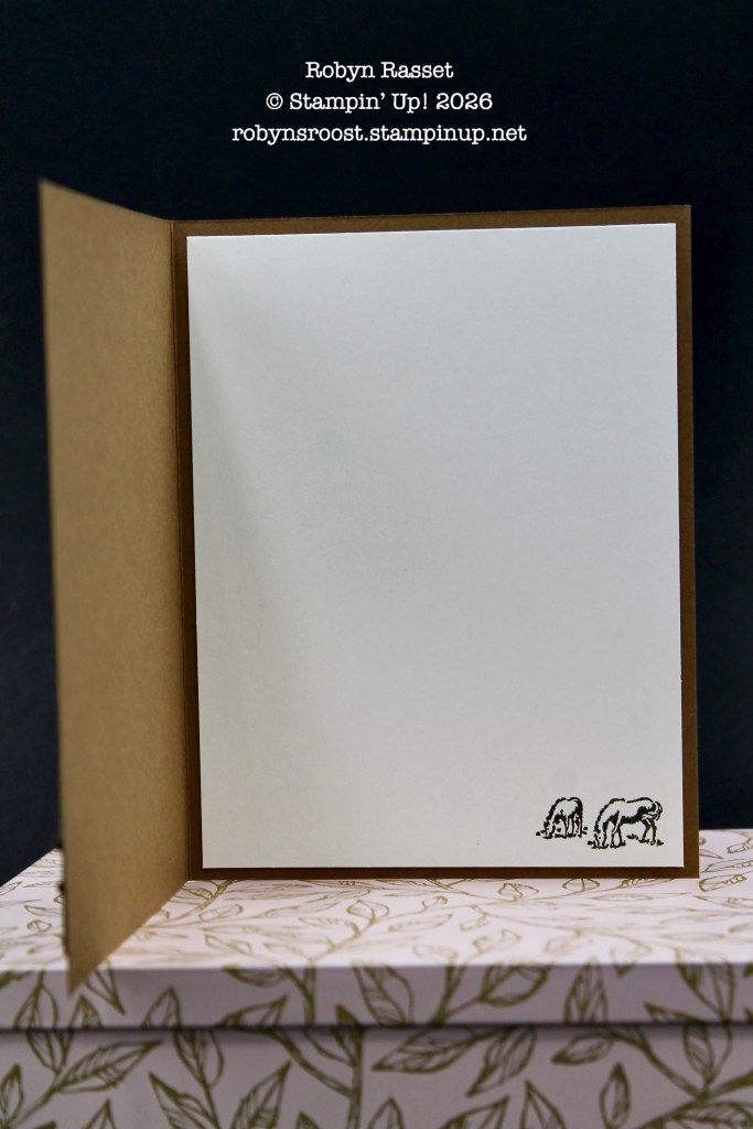 I forgot and used a Stampin’ Blend Alcohol Marker to color the horse’s halter and it bled through the paper so I needed to add a little something to the inside. The circular floral die cut was cut from the left over circle from the front die cut. SAVE those scraps!