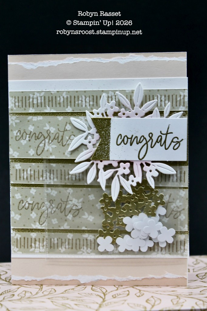 I drew lines on the card cardstock and used a Q-Tip to add VersaMark to only the narrow strips. The lines and words were stamped onto the patterned paper with Crumb Cake ink just like the original card. I’m amazed at how much the Crumb Cake ink looks like gold embossing!