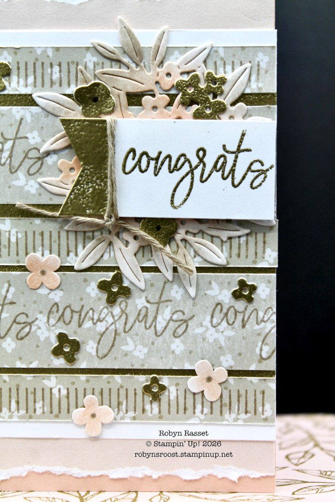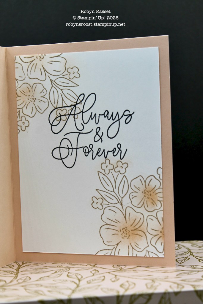 The flowers on the inside were stamped with Crumb Cake ink, Gold Embossing Powder could be used here too. They were colored with a Blending Brush and Petal Pink ink.