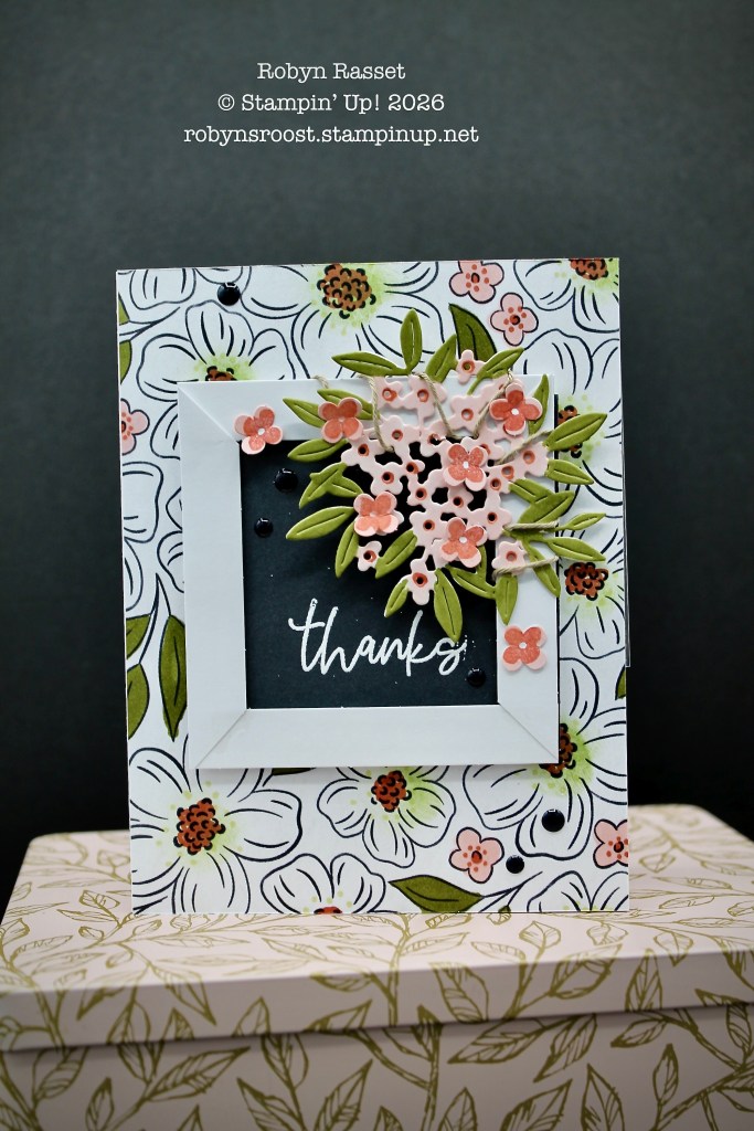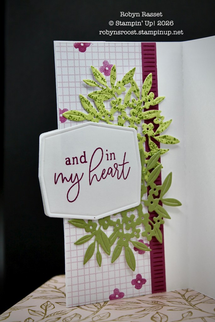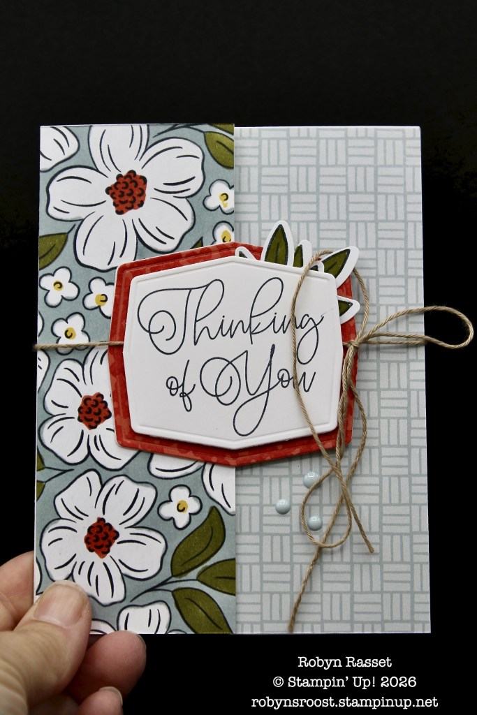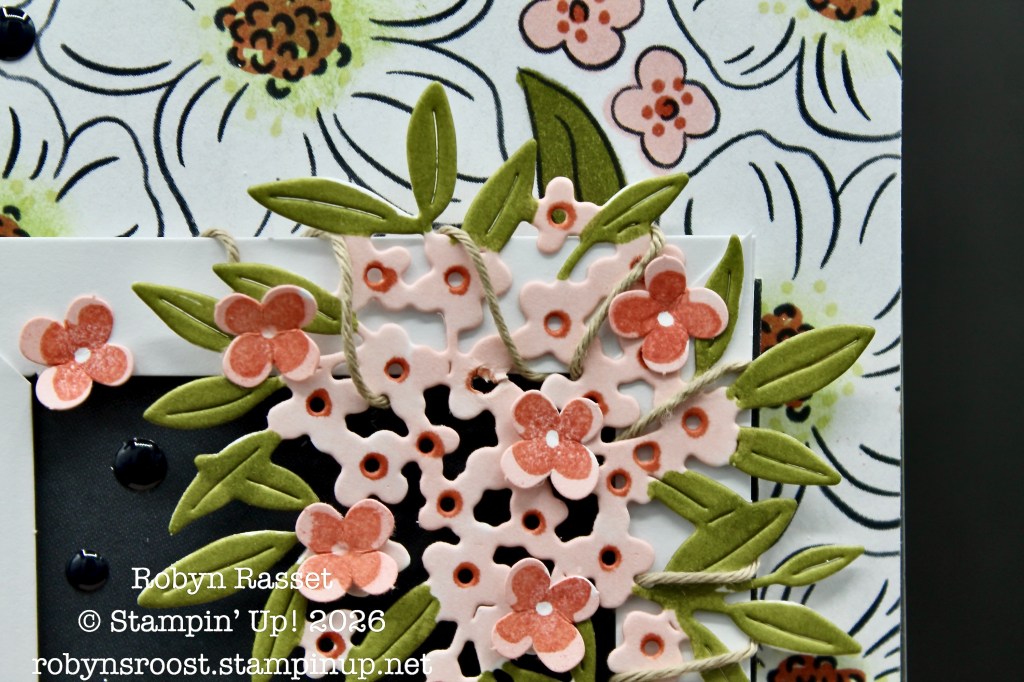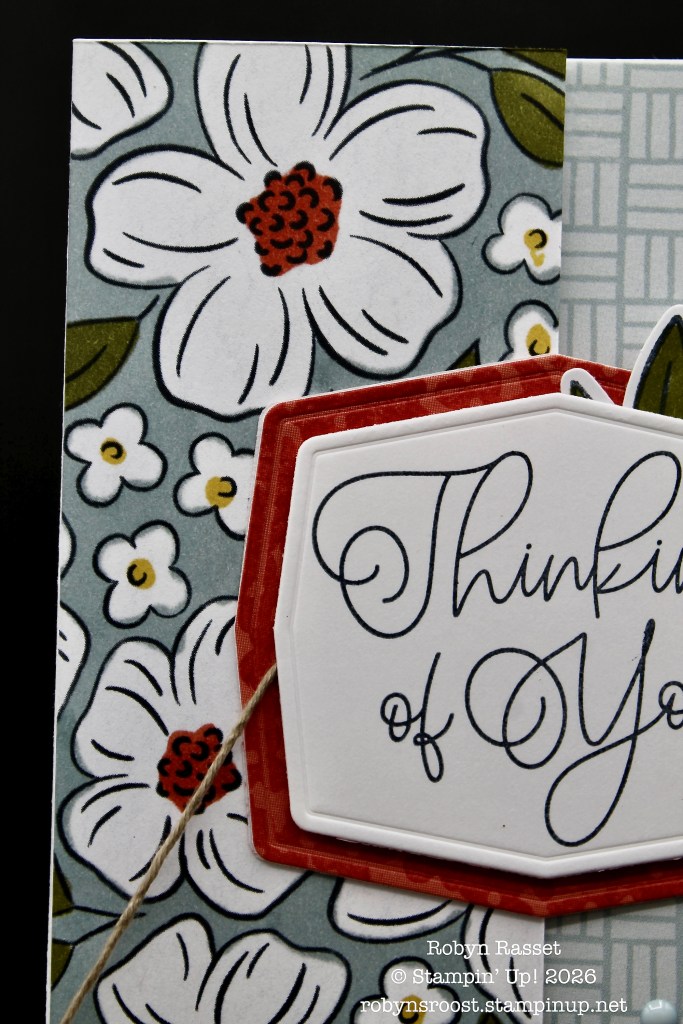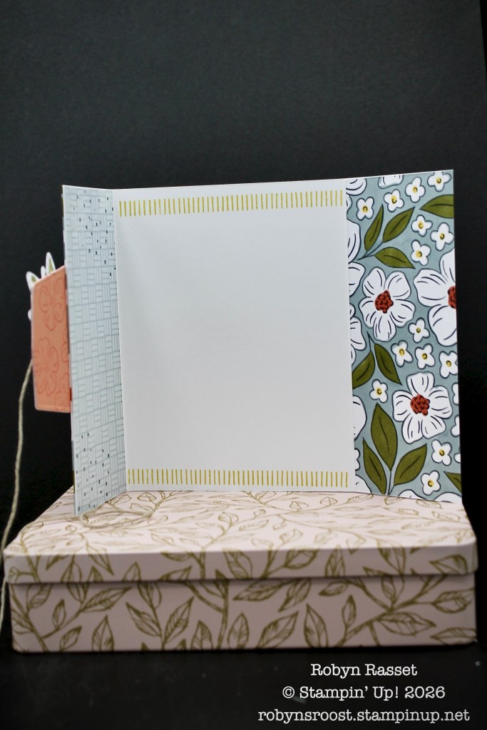 Here’s a view of the card open and you can see the designer paper with the panels. The floral DSP was a black and white paper design and was colored using the Stampin’ Blend Alcohol Markers. Two labels were die cut and sandwiched together. The twine which holds the card closed with a bow is anchored between the small greeting label and the larger labels. Both of the larger labels have been stamped with different flower images.