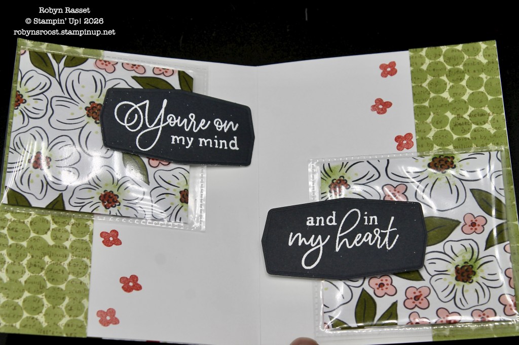 Here are a couple of views of the inside of the card. WOW, right? These small Flip Flaps were adhered between the card base and the stamped designer paper. The greetings are heat embossed in white.