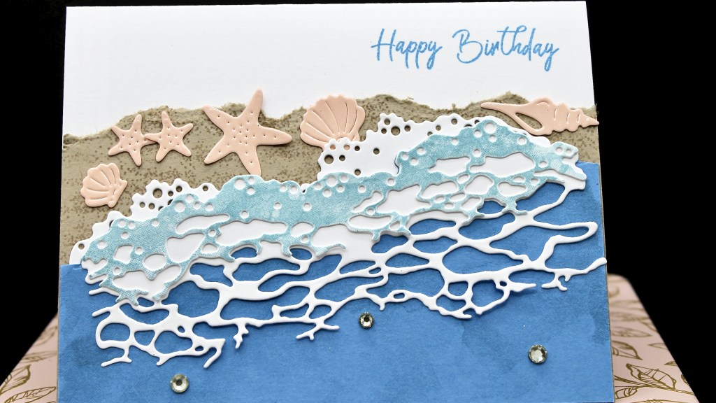 I just started playing with the Rolling Waves Bundle, which is a new item coming out in March. It combines a set of dies that create images of waves with stamps to add texture. I always enjoy a day at the ocean watching the waves roll in and cards made with this set are sure to recreate that relaxing feeling.