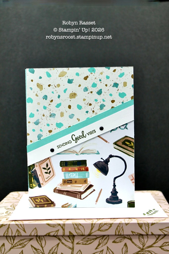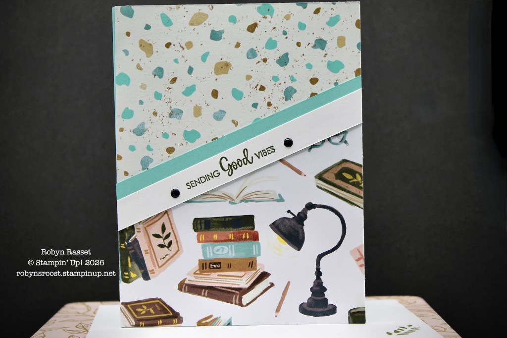This card is a cut once create two cards pattern. Simply place two patterned papers (5 1/2″ x 4 1/4″) face-to-face and cut in half diagonally. Now there are two pieces that can be placed top and bottom. The cards will have different patterns on top and bottom.