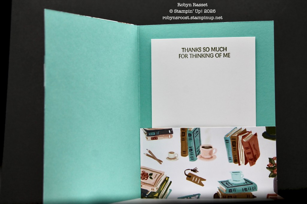 The inside of the card has a pocket to hold a note and maybe a gift card. The 4 1/4″ x 2 1/4″ piece of patterned paper is glued to the inside of the card with a thin line of liquid glue along the three edges. Super easy!