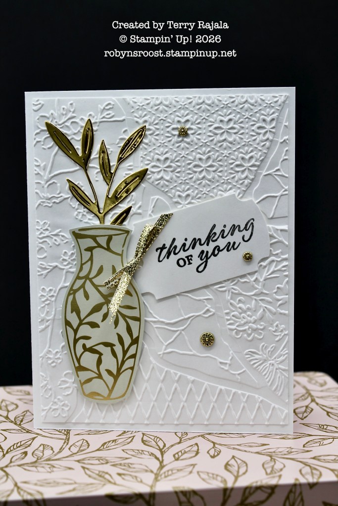 As usual my friend Terry has created an elegant card! We all have a certain style of card making and Terry’s is elegant. I love the white card with gold accents! The Gold Foil sprig in the pot is a die cut from the Pretty Florals Die set..