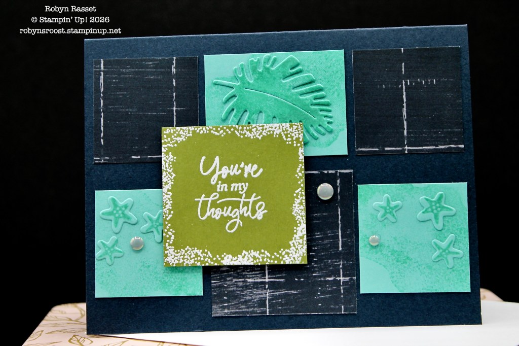 The leaf is also colored with the large water image but is stamped full strength. The little starfish were die cut first and then stamped, again with Coastal Cabana. If I were doing more than one card, I would line the stamps up in the die, stamp first and then die cut (I think?). It was a bit of a struggle lining up the little images on the tiny pieces of paper.