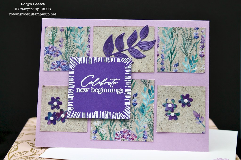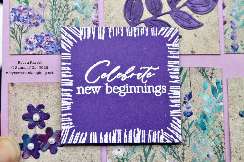I used a Blending Brush and ‘flicked’ the edges of the DSP squares with Fresh Freesia ink to give them a softer edge. The little flowers and the leaf were cut from scraps of the Perennial Lavender paper.