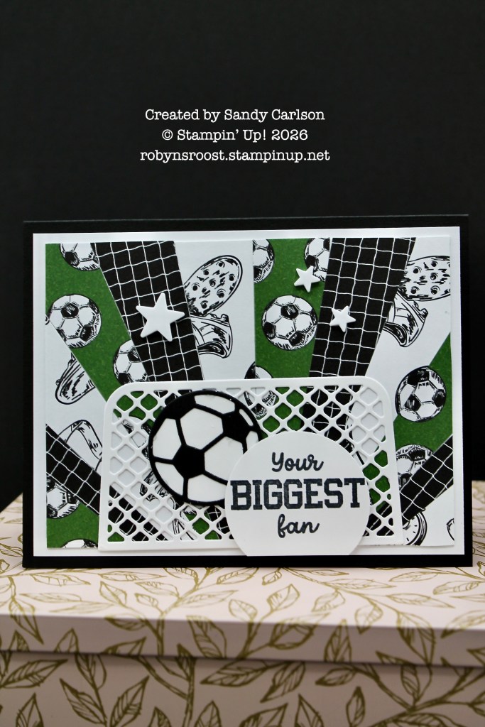 The sunburst background on Sandy’s card is perfect for behind the net! It’s created with pieces of the A Wonderful Match Designer Series Paper. The coordinating Match Day Bundle was used for the greeting and die cut pieces.