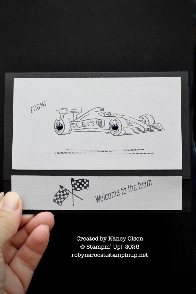 To close the card the top edge is tucked under the layer with the checkered flags. Here you can see it not tucked in.