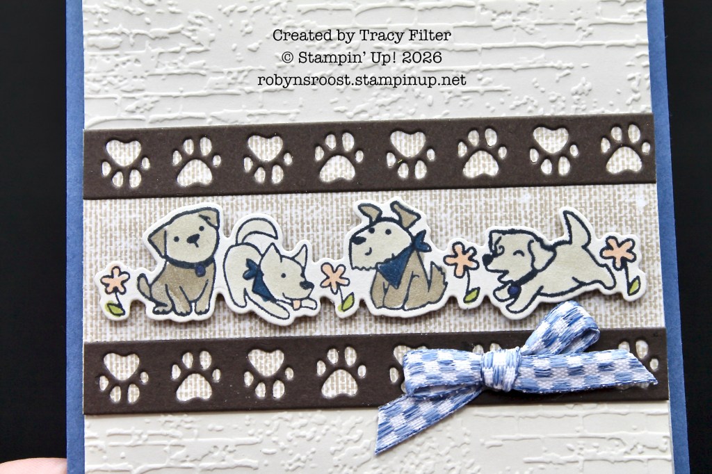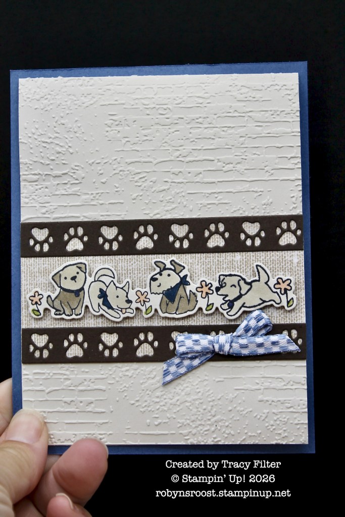 Tracy has used the die cut paws border to outline her pups. This die cuts a 1/2″ border of paw prints. The background is embossed with the Exposed Brick Embossing Folder. A Misty Moonlight Checked Ribbon pulls in the card base color. This is actually a panel card, which uses a 4 1/4″ x 5 1/2″ base and has a 4″ x 10 1/2″ folded layer adhered to the center of it.