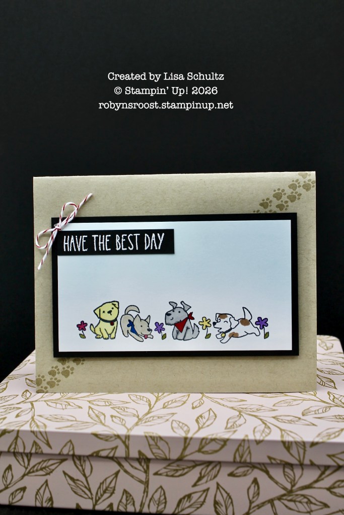 First let’s look at Lisa’s card. I love the paw prints dancing across the background. The greeting is heat embossed with White Embossing Powder and I love the placement of it. The little baker’s twine bow adds a pop of red to the edge of the greeting.
