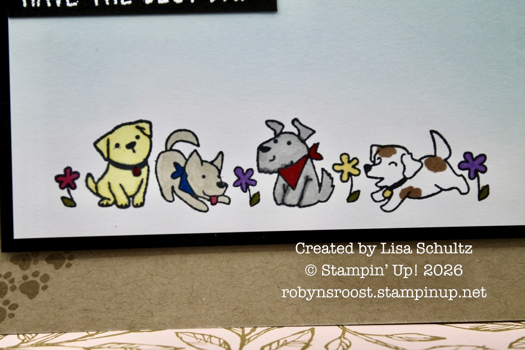 The background of the white paper has been lightly colored using a Blending Brush and maybe Balmy Blue ink. Each pup is carefully colored to give it personality and character. The entire layer is lifted up with dimensionals to make it really pop.