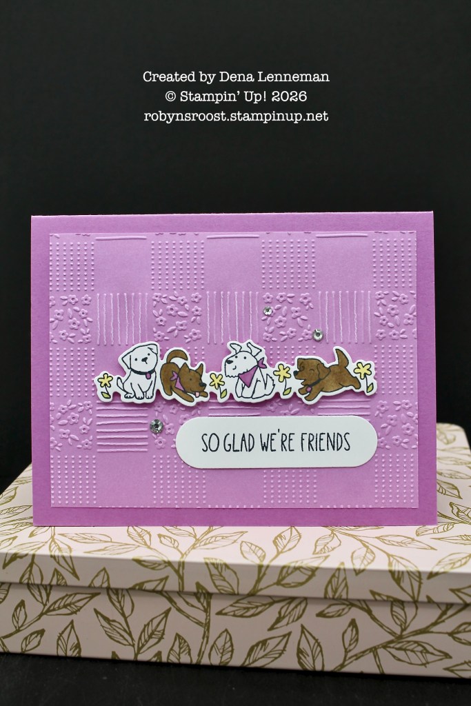 Dena’s card is done in Petunia Pop with the dog’s neckerchiefs and tags in matching colors. The background is a piece of the Two-Tone Cardstock and some of the white core shows through when embossed. I can’t remember the name of this embossing folder and it is no longer available.