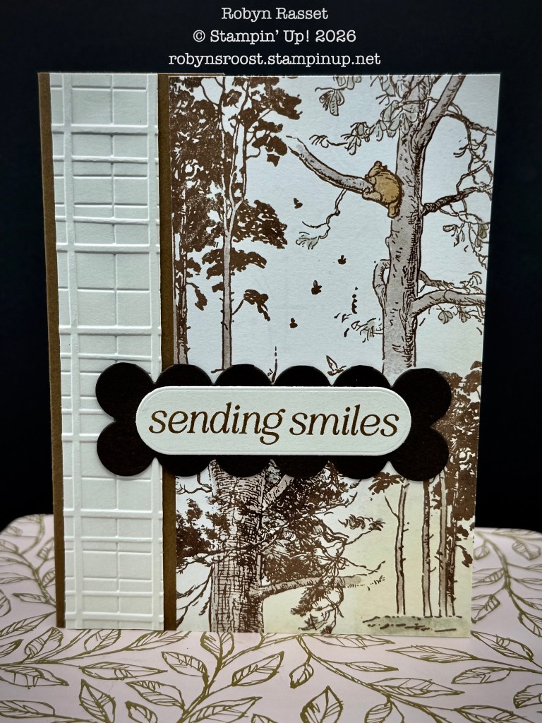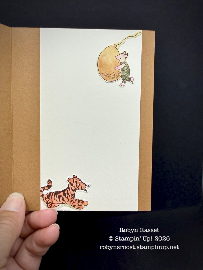 For the inside I used a 3″ x 5 1/2″ piece of Very Vanilla to match the DSP layer on the front. I fussy cut two of the adorable figures from the DSP. Even if a tail or paw are missing, tuck the figure in a corner and it looks great.